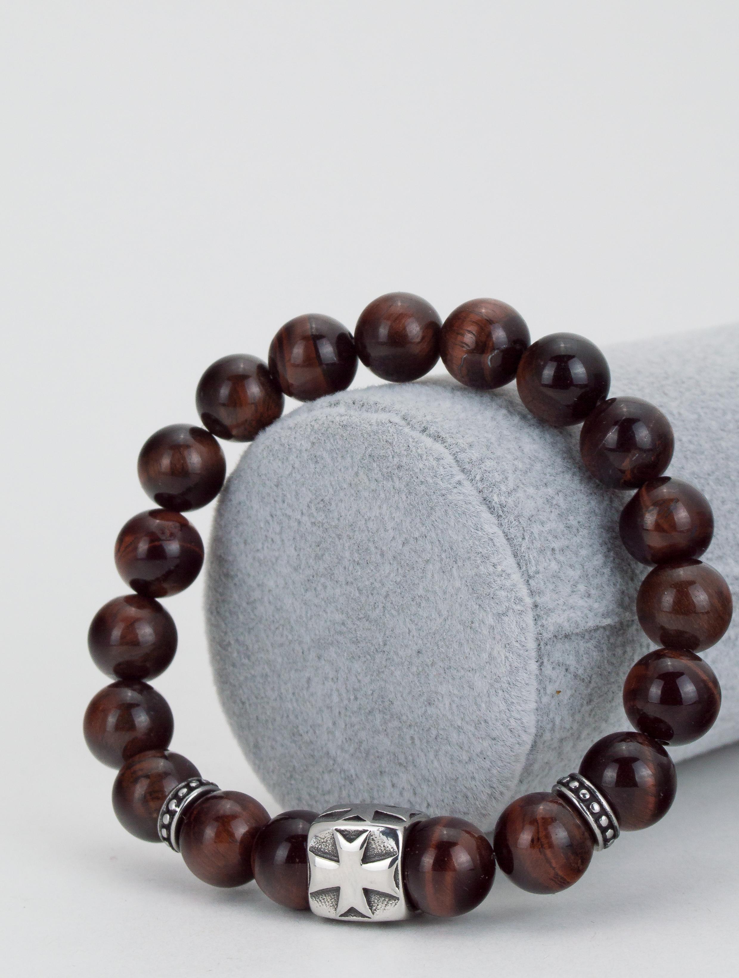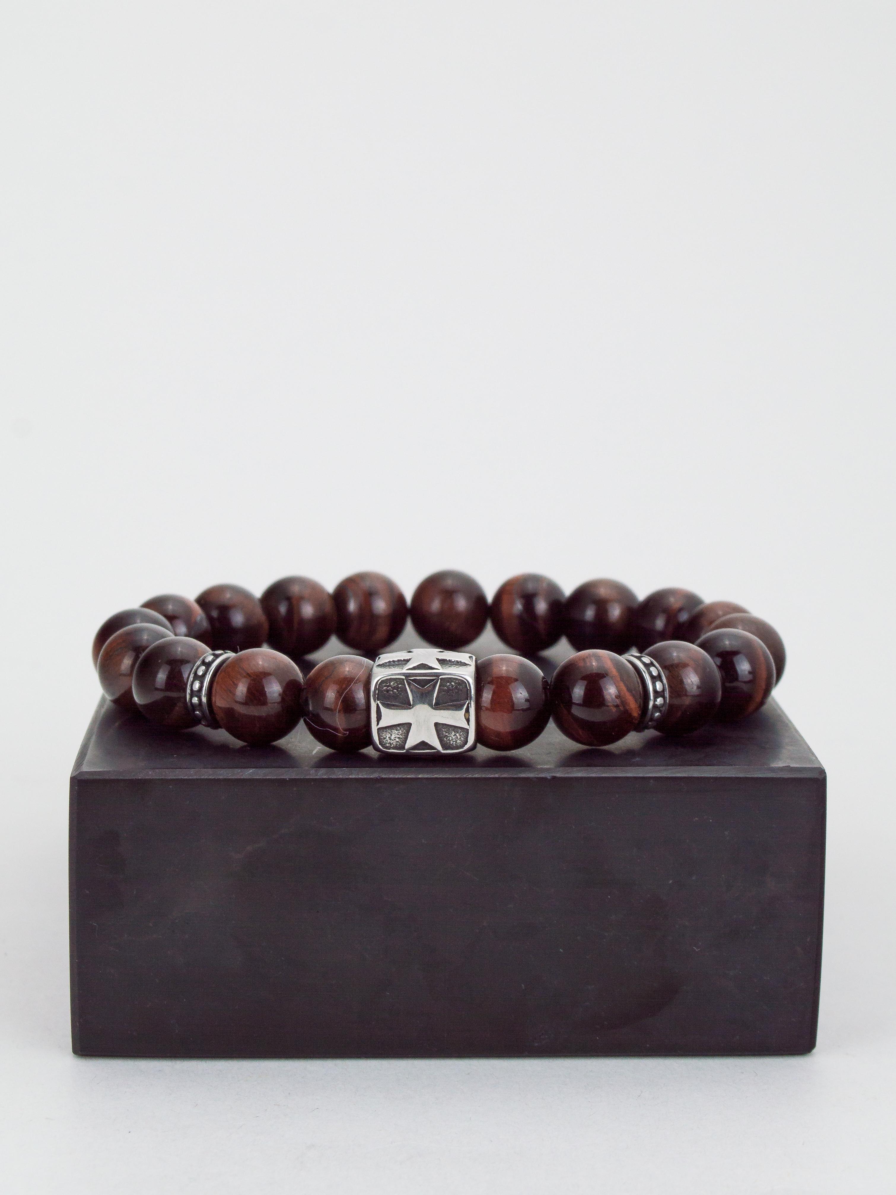 Браслет из натурального красного тигрового глаза (бычий глаз). Бусины 10 мм. Вставки родированный сплав.