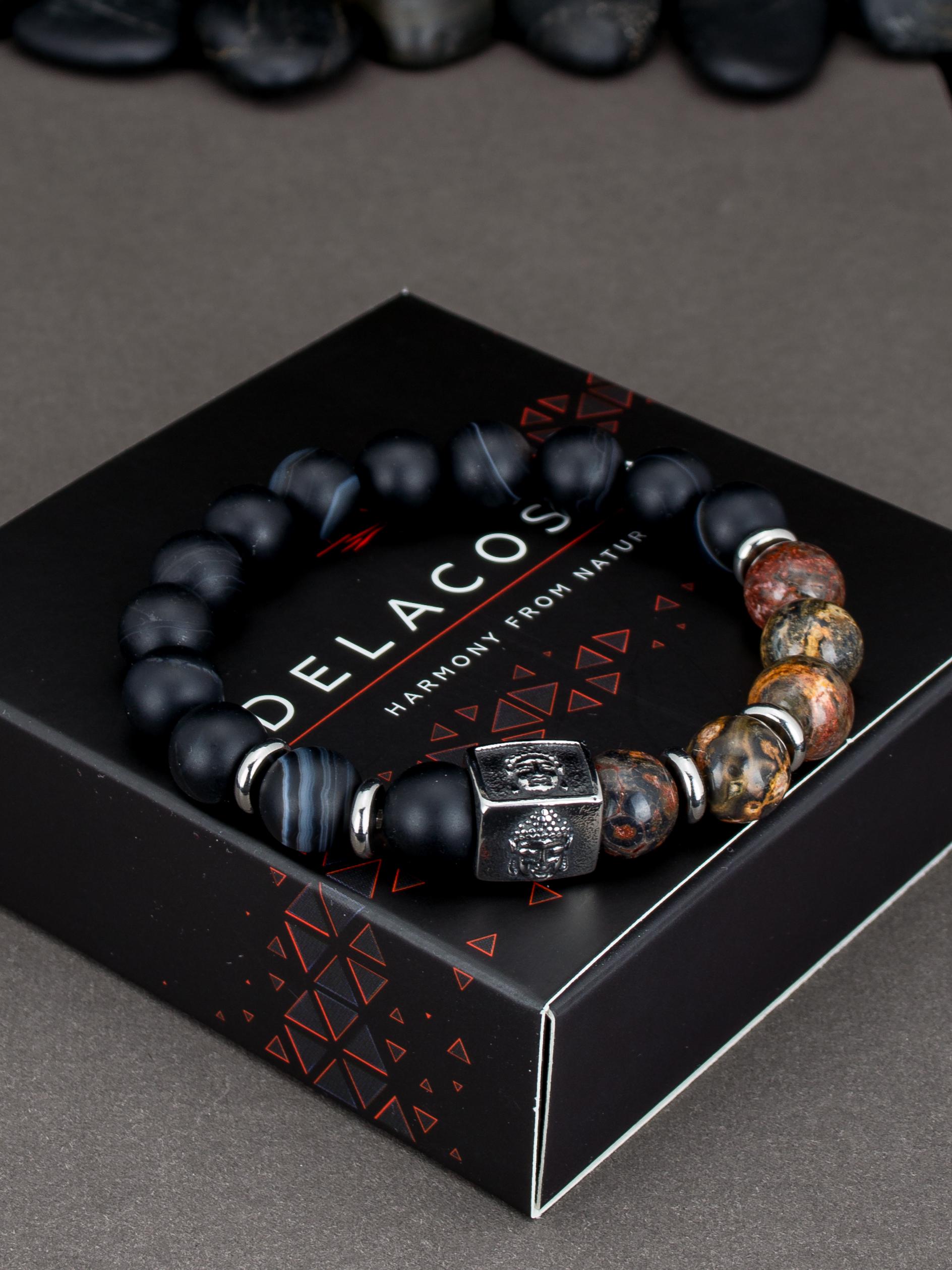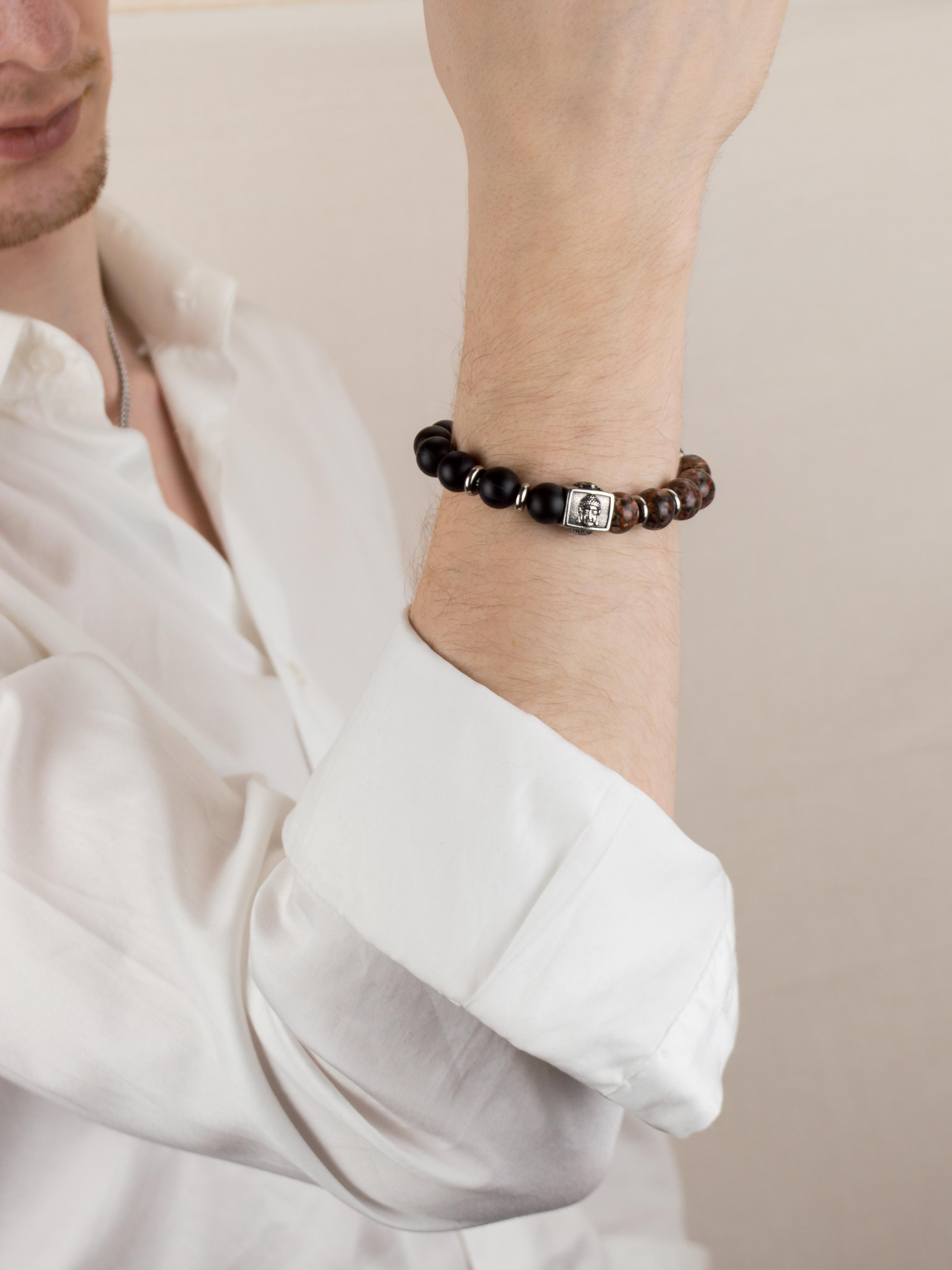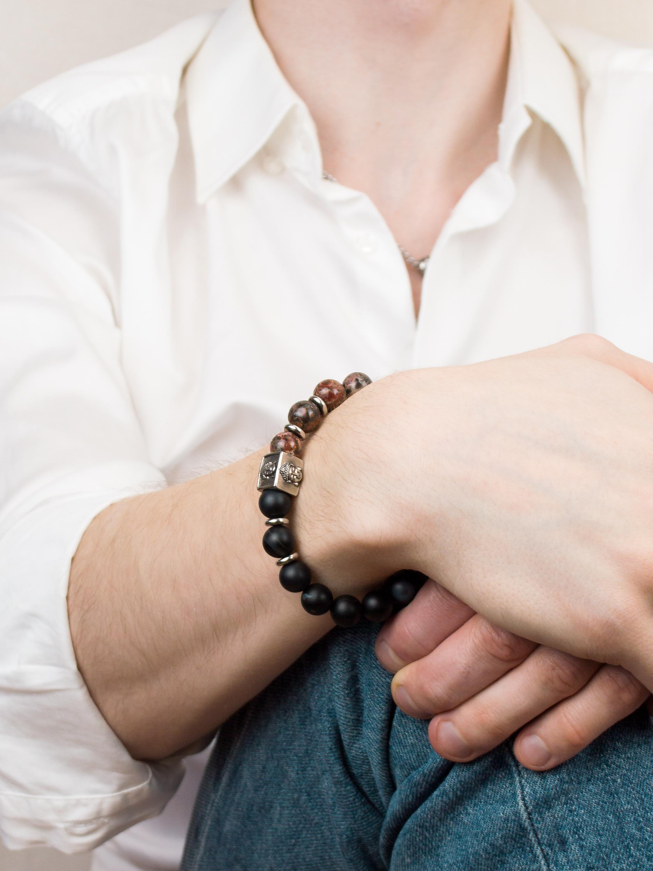 Браслет из натурального черного матового агата и леопардовой яшмы. Бусины 10 мм. Вставки родированный сплав. Вставка Будды