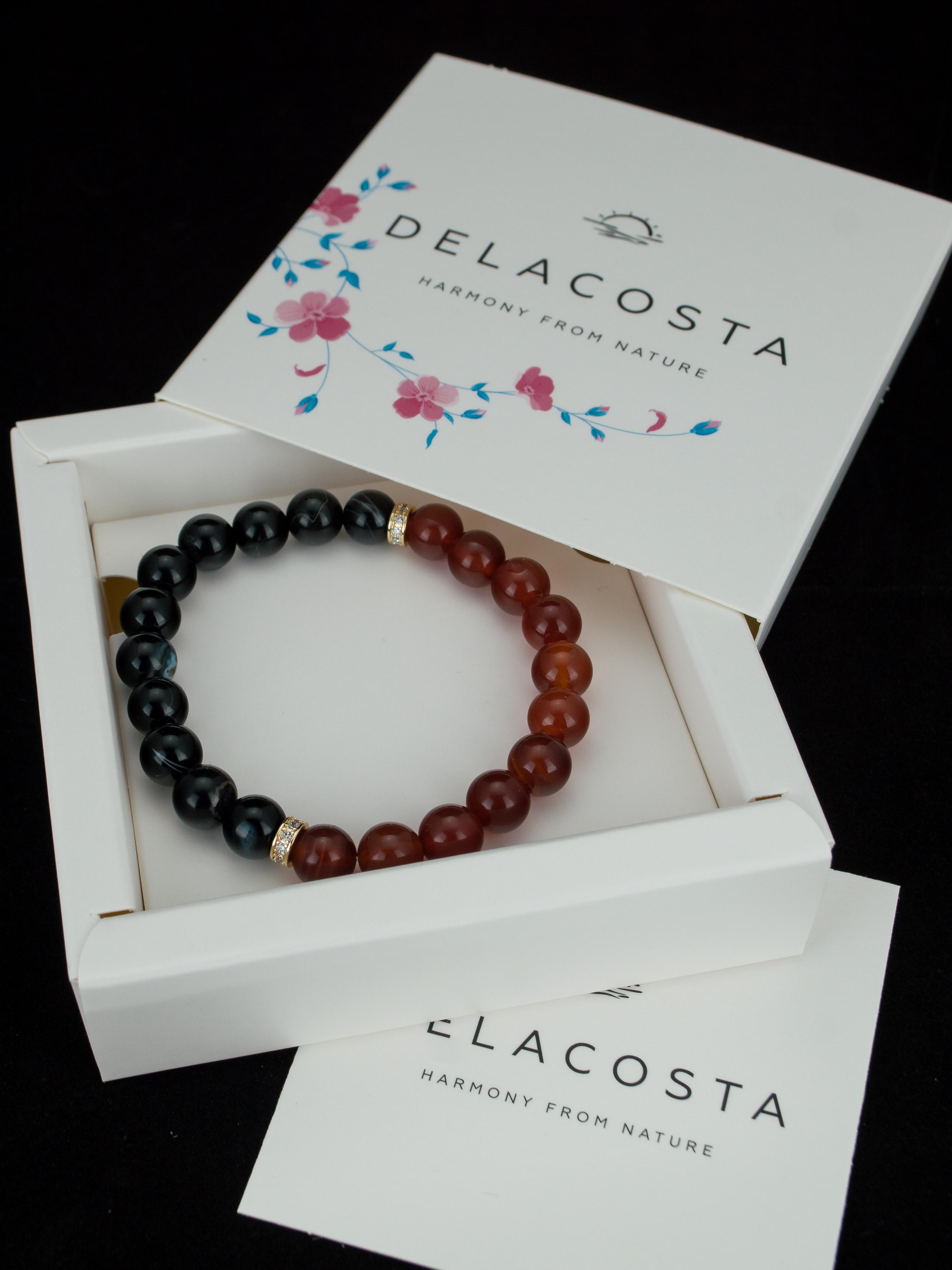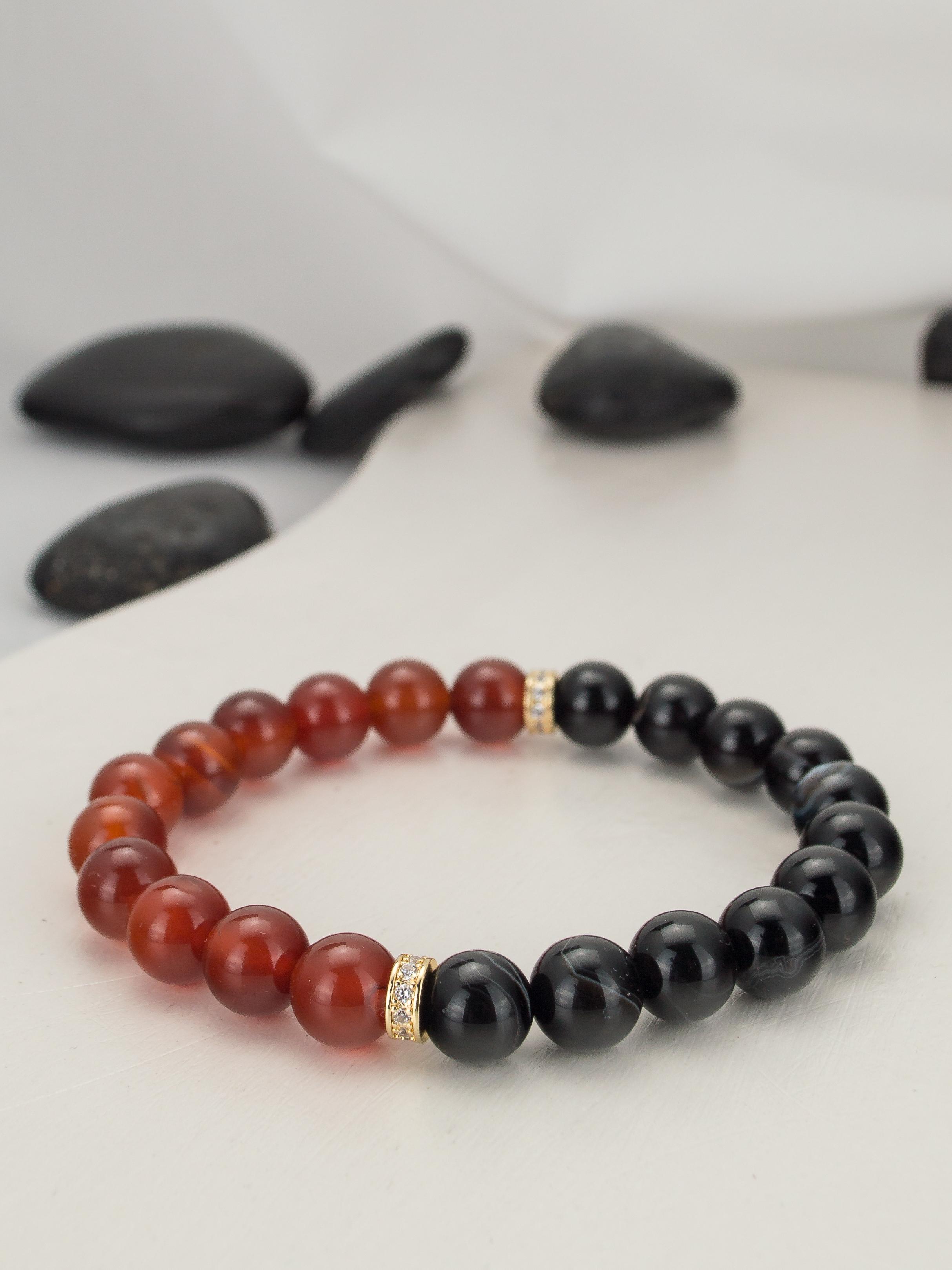 Браслет из натурального черного агата и сердолика. Бусины 8 мм. Вставки родированный сплав.