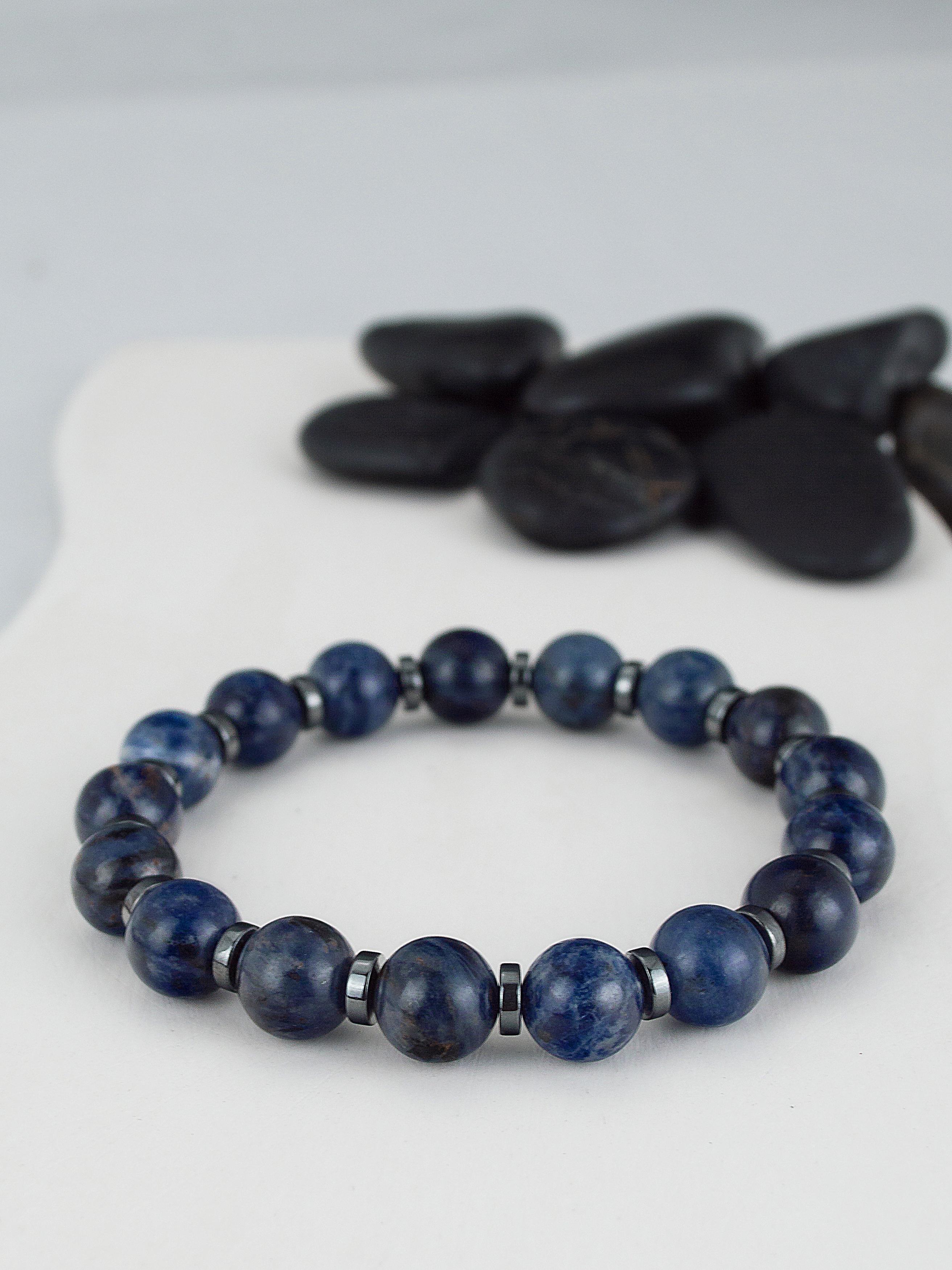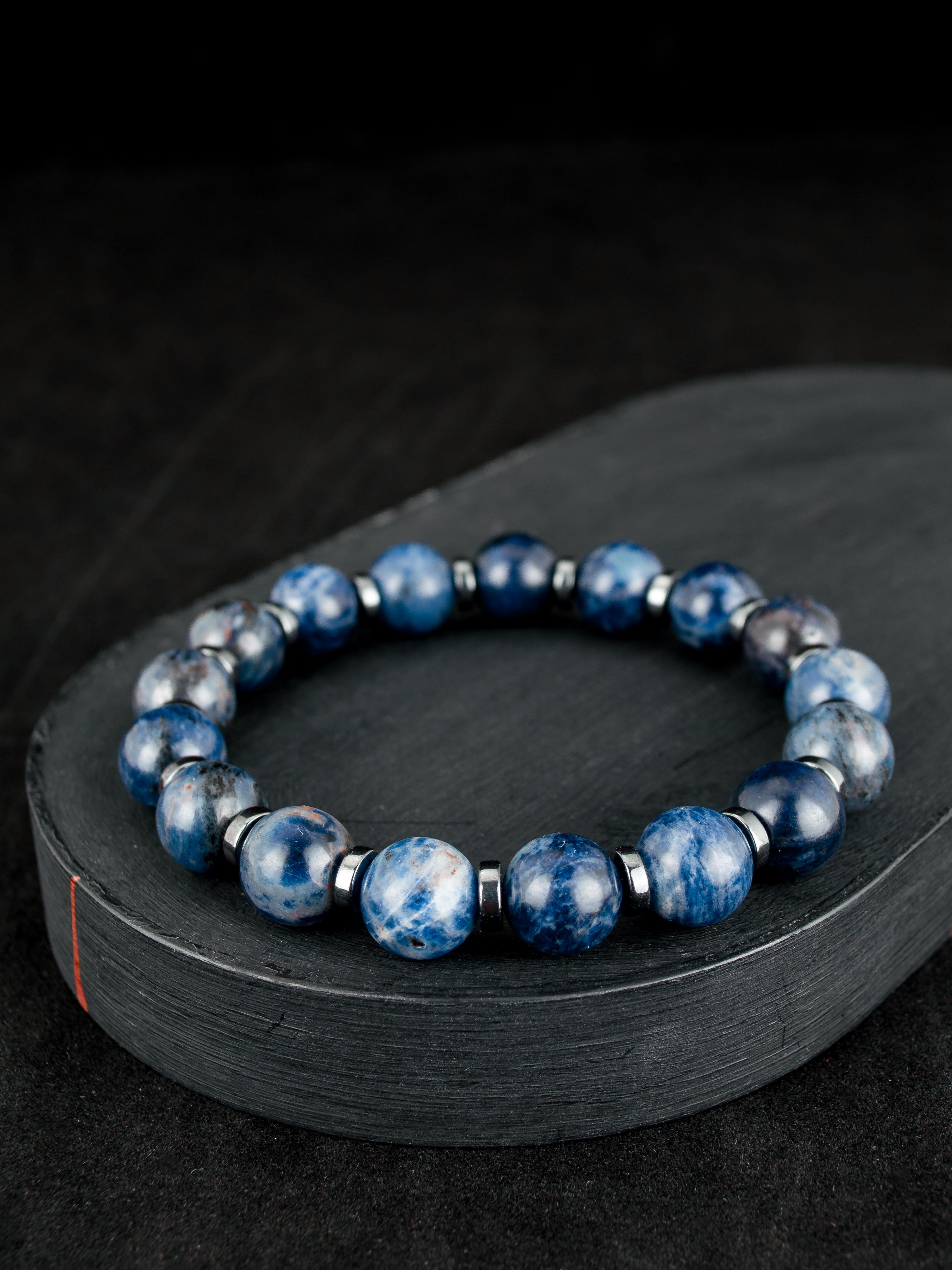 Браслет из натурального содалита. Бусины 10 мм. Вставки выполнены из гематита.