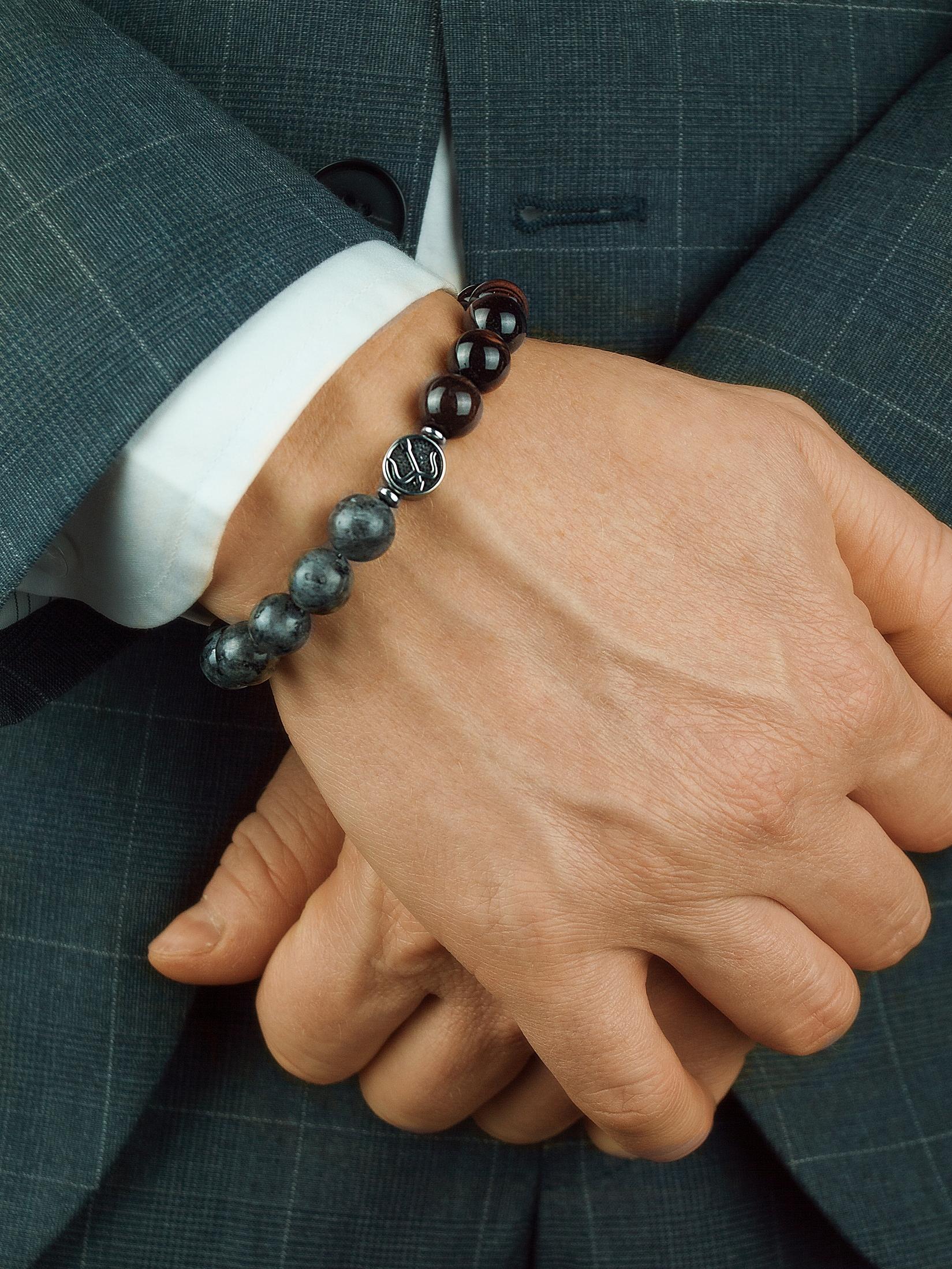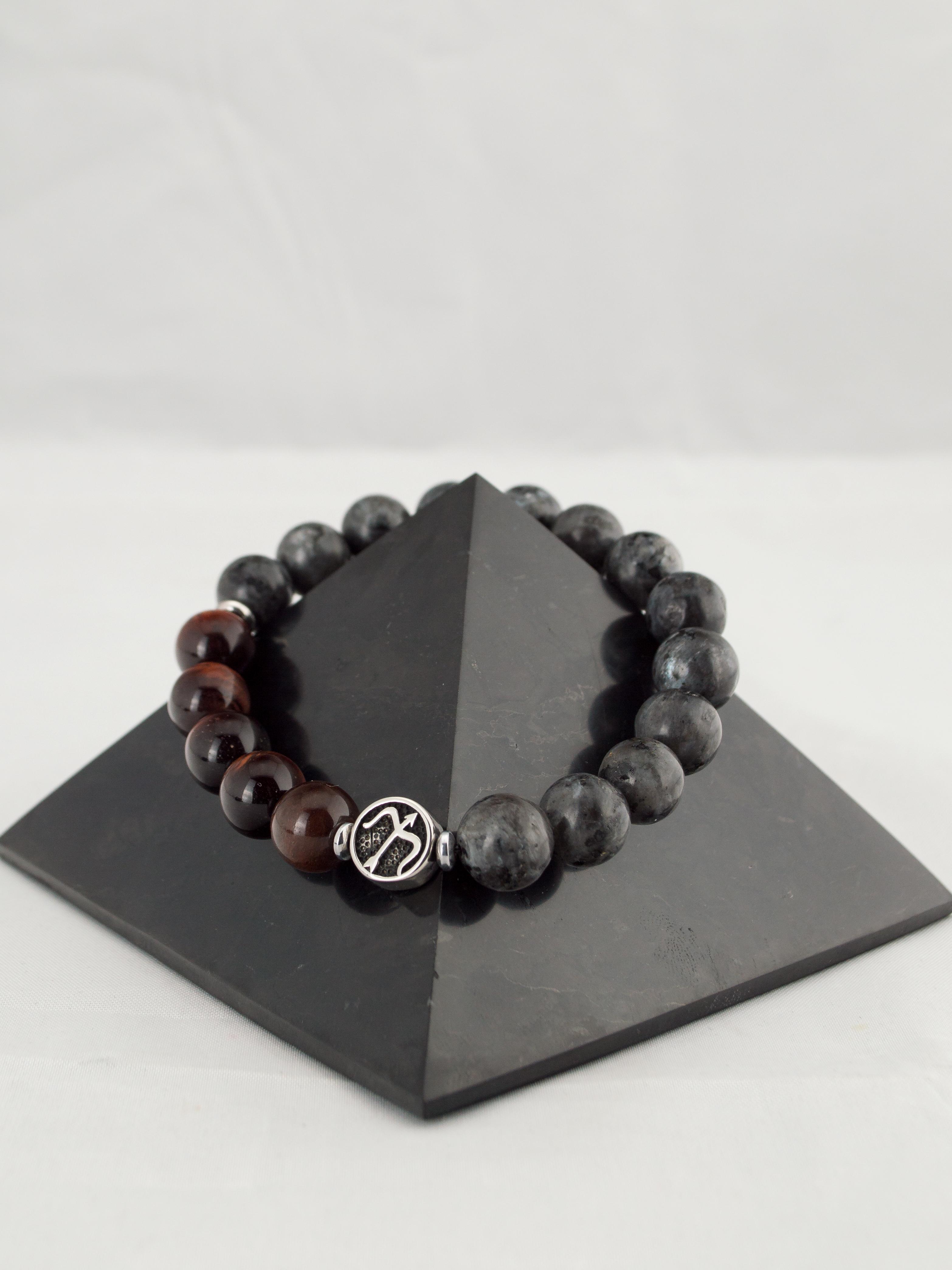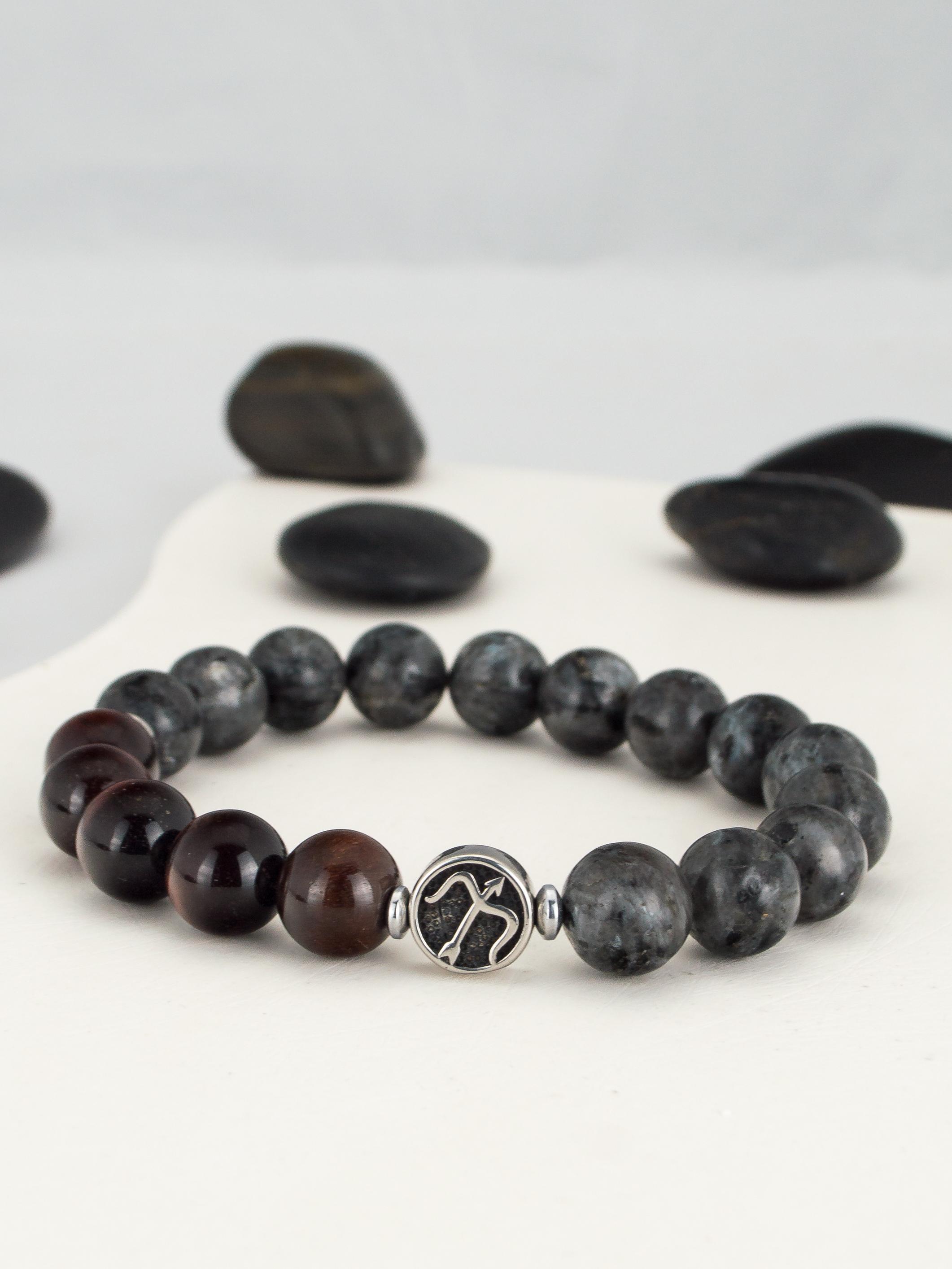Браслет из натурального тигрового глаза (красный, бычий глаз) и лабрадорита. Бусины 10 мм. Знак зодиака Стрелец. Вставки сталь и гематит.