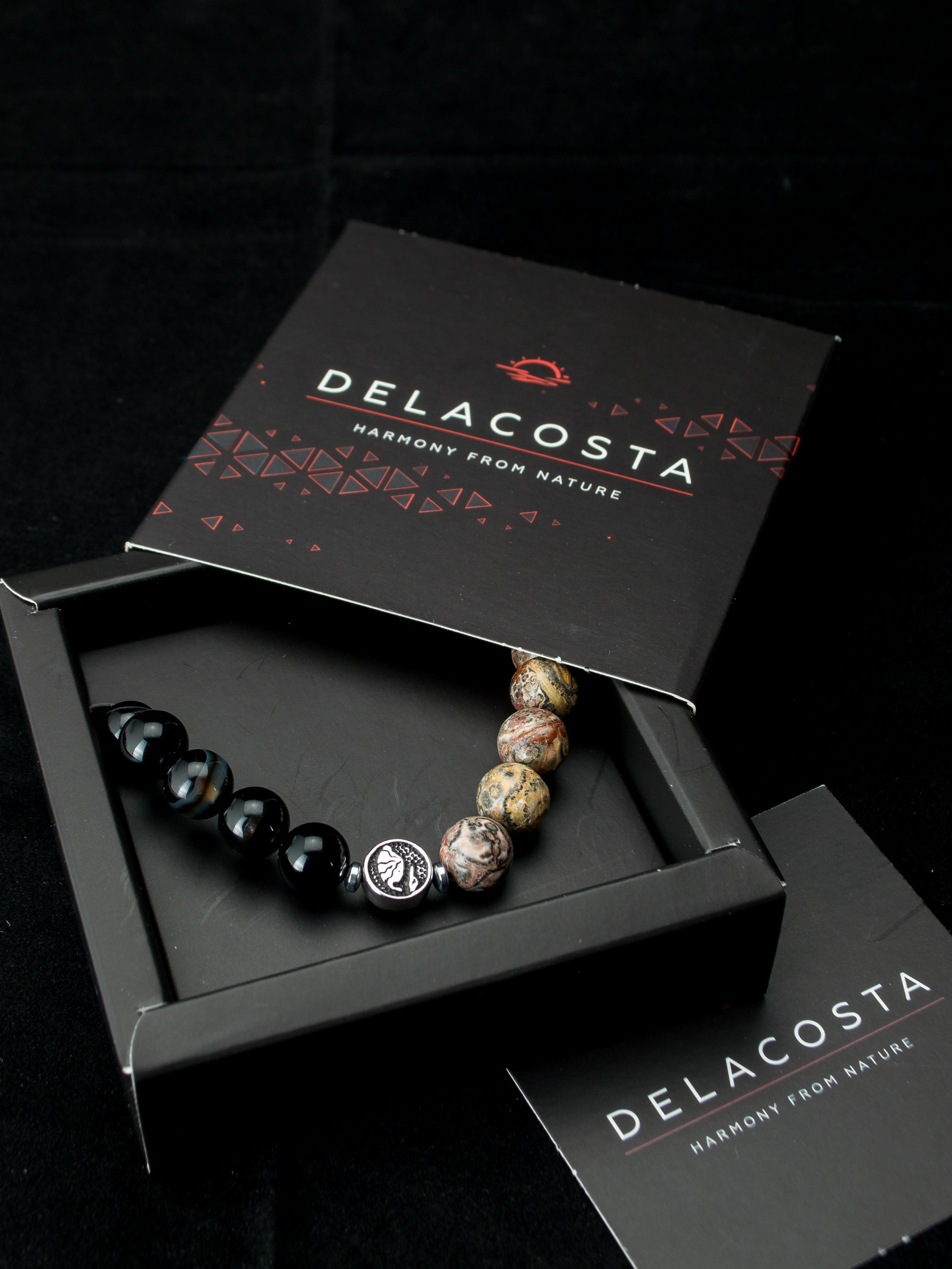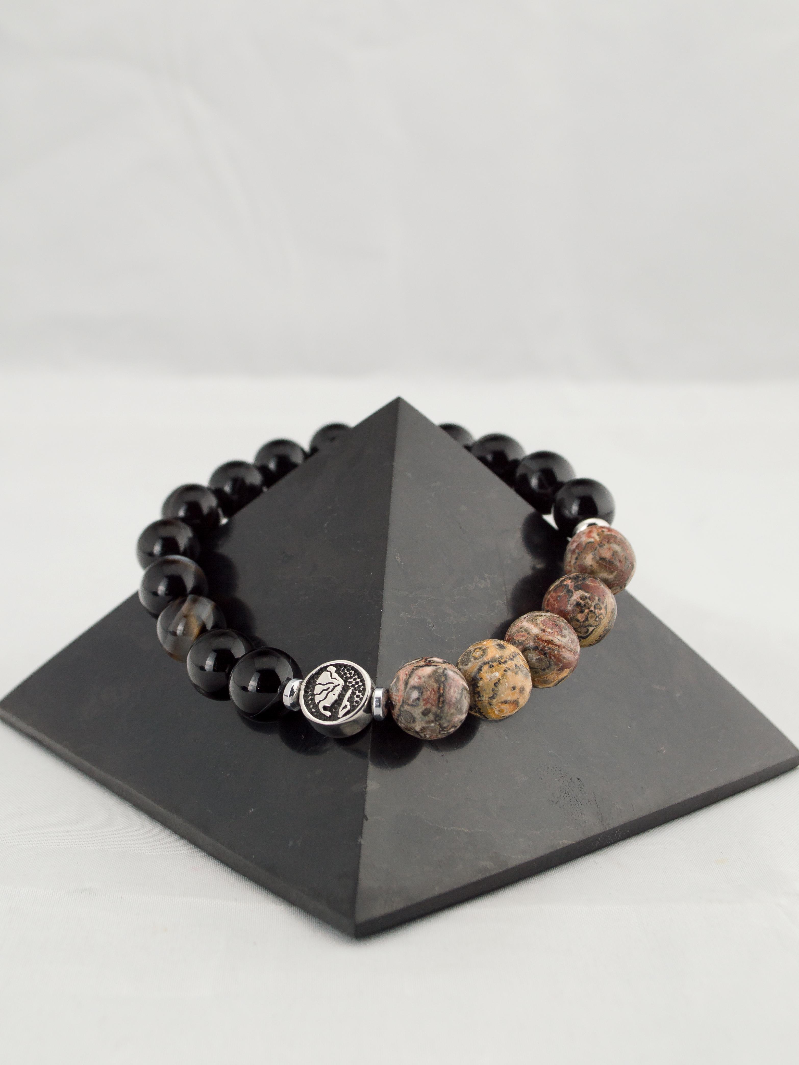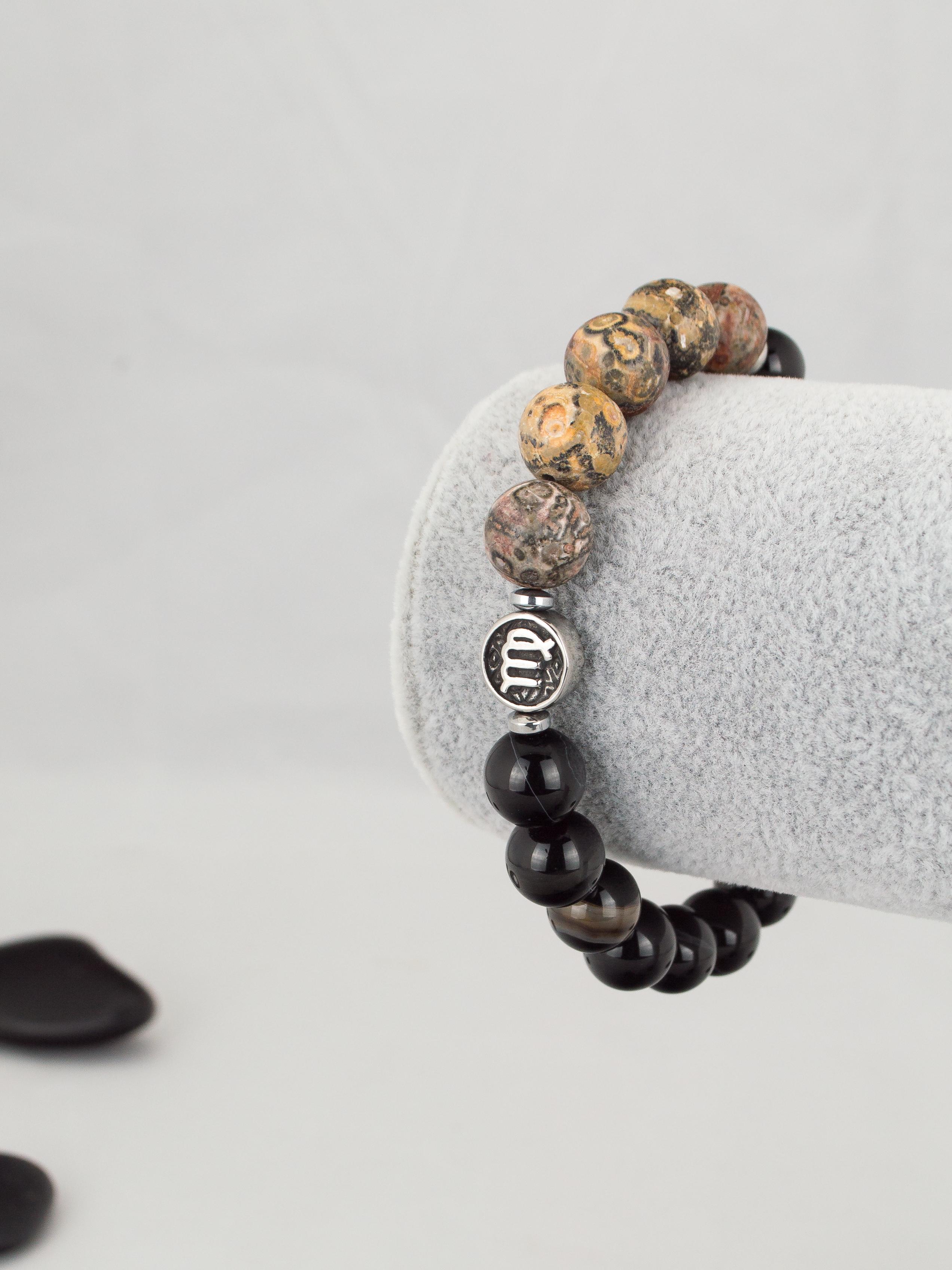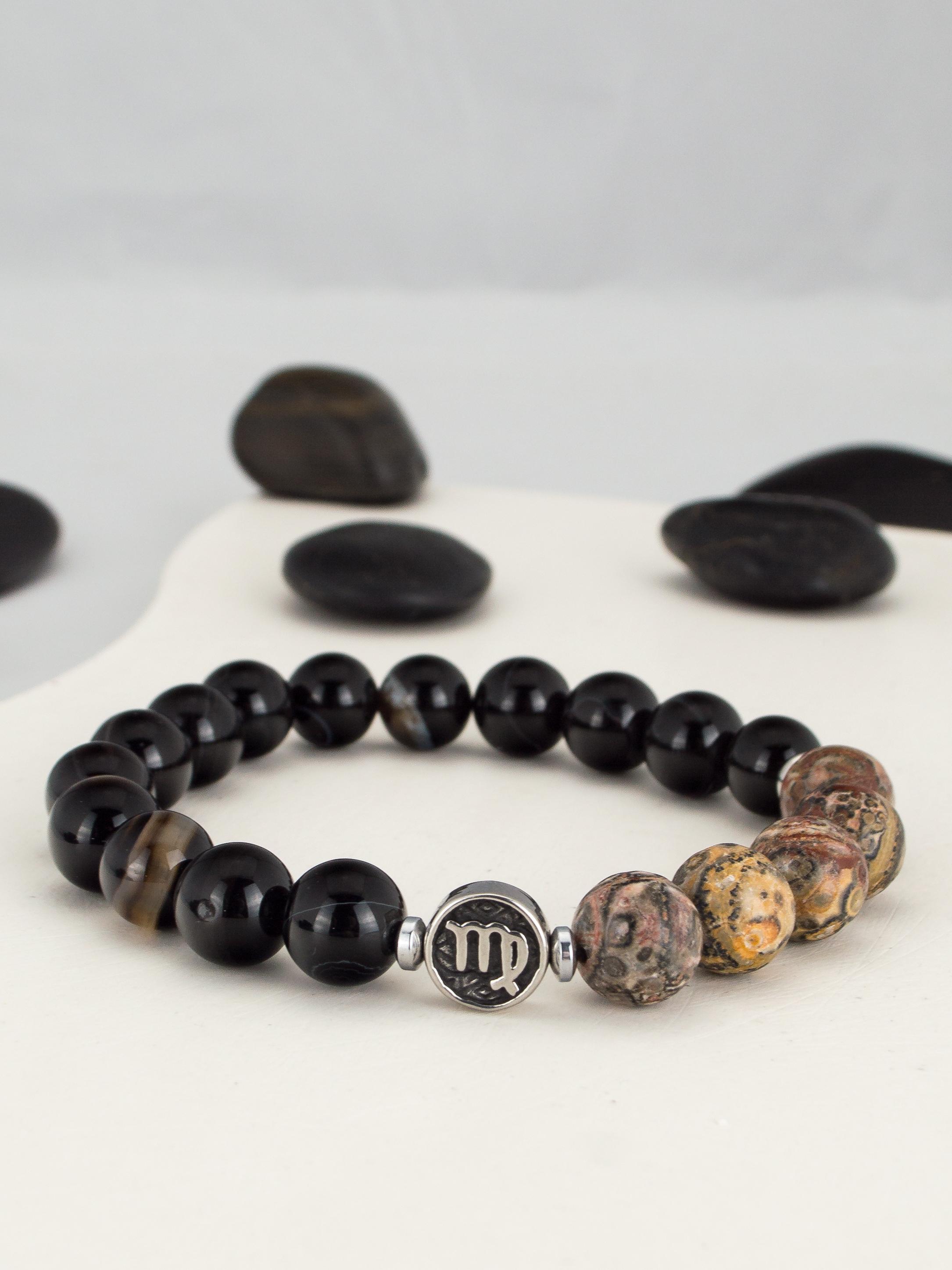 Браслет из натурального черного агата и леопардовой яшмы. Бусины 10 мм. Знак зодиака Дева. Вставки сталь и гематит.